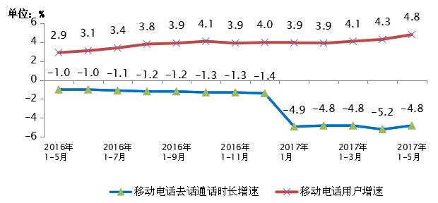 2016-2017年5月移动电话用户和通话量增幅比较
