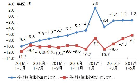 2016-2017年5月移动短信业务量和收入同比增长情况