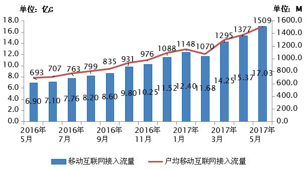 2016-2017年5月当月移动互联网接入流量和户均流量比较
