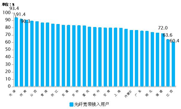 5月末,东、中、西部地区光纤宽带接入用户分别达到12932万户、6669万户和5931万户,用户渗透率中部地区领先,达到81.2%,东部、西部地区分别为79.7%和80.4%,各省间光纤宽带接入用户占比差异呈缩小态势,天津、河北和河南分别居全国前三位,占比均超过90%。
