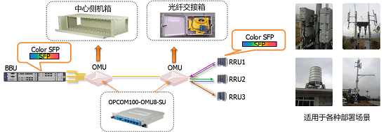 移动宏基站建设采用传统裸纤直驱时,每宏基站存在3个RRU小区扇面,BBU-RRU之间需要6芯裸纤用于传输RRU的CPRI信号。采用移动前传无源解决方案(PSBU)后,从BBU设备侧,通过无源扩展器OMU收敛3个扇区的 CPRI信号后变成1芯光缆出局,在RRU侧再通过同样的无源扩展器OMU分离3个扇区的信号。PSBU方案成对使用,大量减少BBU-RRU之间的裸纤消耗,光纤收敛比高达1:12或1:18。 同时,PSBU方案提供了免维护、快速安装、超长期稳定的特性,适应于各种C-RAN前传的宏基站和小微基站部署场景。