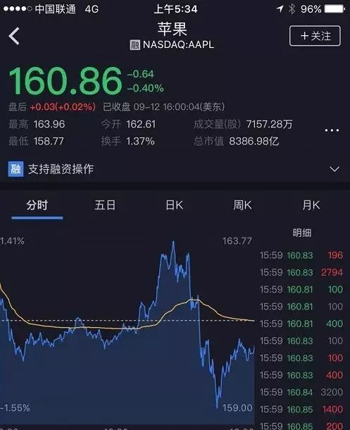 Apple股价在iPhone X发布当日便迅速跳水,最高跌幅1.55%,收盘仍跌0.4%。