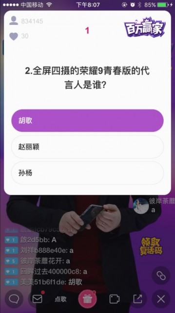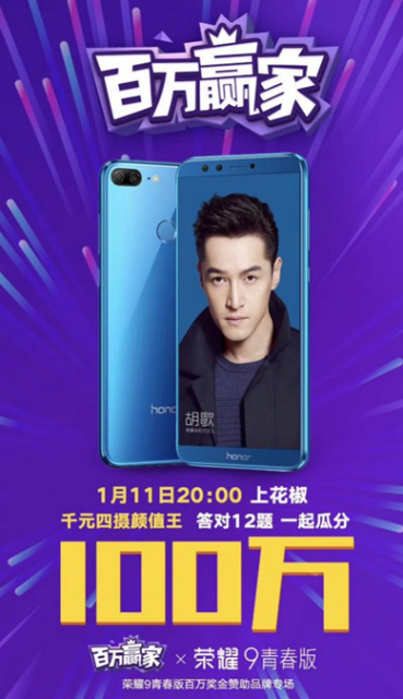 作为金主爸爸的华为,获得设置多道品牌题的权利。比如全屏四摄的荣耀9青春版的代言人是谁?胡歌大大的头像就出现在屏幕左侧。简直就是送分题,金主爸爸真是有钱任性。