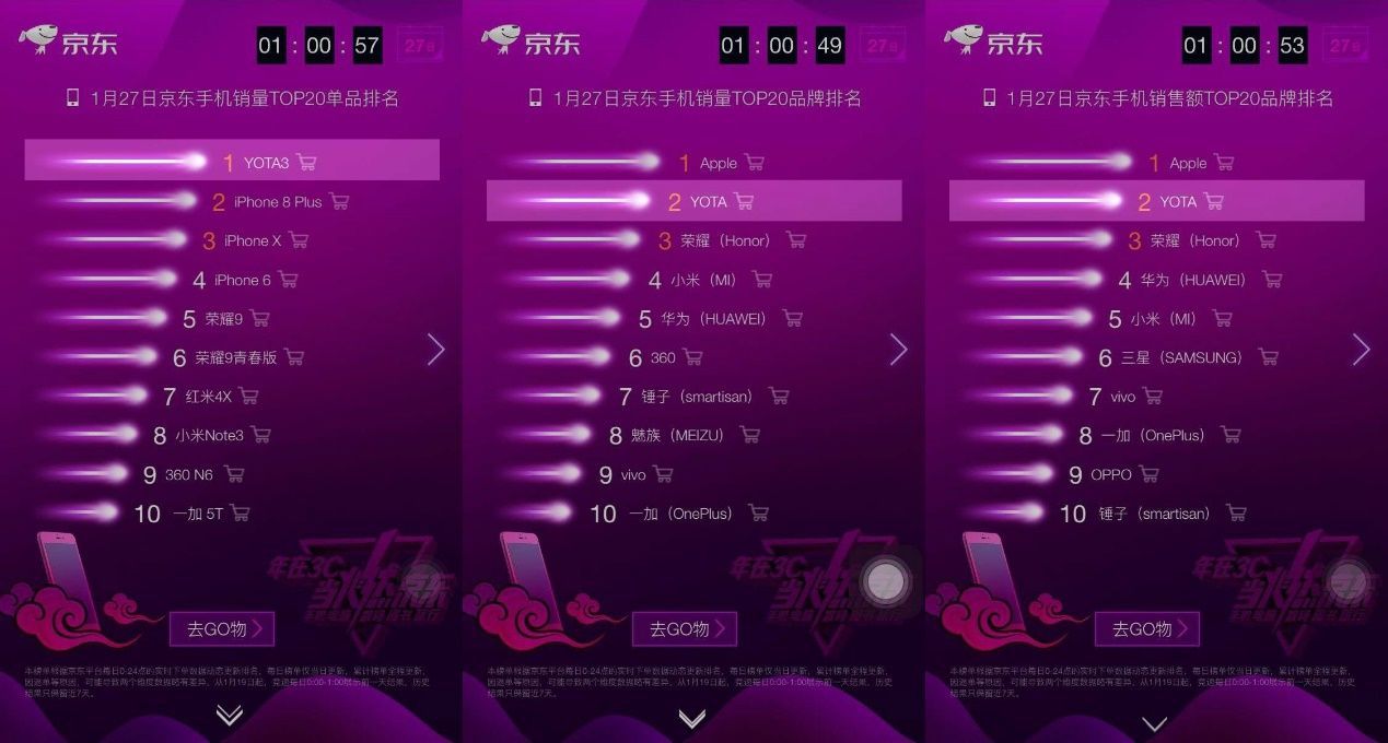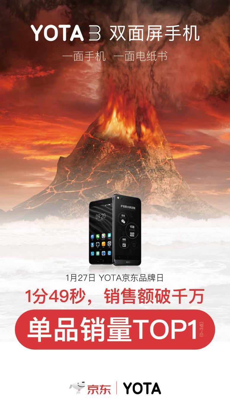 京东手机年货节实时竞速排行榜显示,品牌日启动仅1小时,YOTA3双面屏手机勇夺单品销量第一,YOTA品牌销量、销售额勇夺第二的殊荣。从全国各地区来看,YOTA在北京、河北、四川、重庆、江苏等地区销售火爆,跻身上述地区手机品牌销量TOP3,其中在河北更是夺得手机品牌销量冠军。