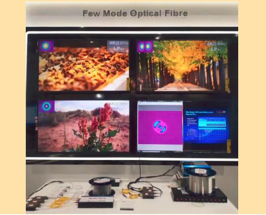 为了推动少模光纤的应用,长飞公司与北京大学合作,开展了少模光纤的系统传输应用研究。在展会现场,进行了少模光纤的现场传输实验,基于弱耦合少模光纤的无MIMO多路复用传输,用一根少模光纤代替多根单模光纤,通过少模光纤的各通道实时传输高清4K视频,受到广泛关注。