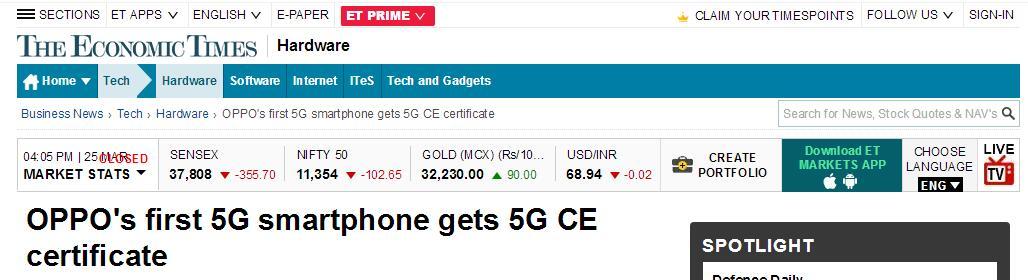 据印度《经济时报》3月25日报道,近日,中国手机制造商OPPO首款5G智能手机成功通过了国际检测服务机构“Sporton International Inc .”的5G CE测试,并获得5G CE认证证书。