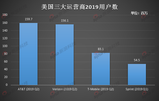 2019美国四大运营商财报披露,T-Mobile(2019 Q2:8310万)与Sprint(2019 Q1:5450万)用户数相加1.38亿,大大缩小与两巨头的差距,减小与其的竞争压力。[AT&T(2019 Q2:1.59亿),Verizon(2019 Q2:1.56亿)。]