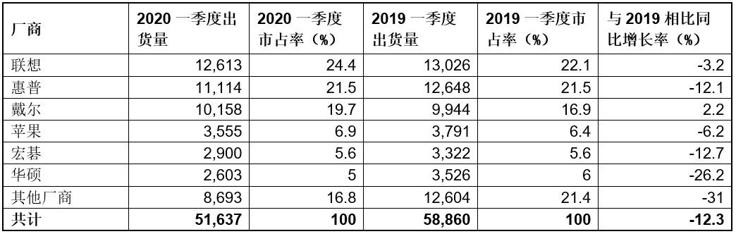 表1:2020一季度全球市场PC出货量初步统计结果(以千台为单位)
