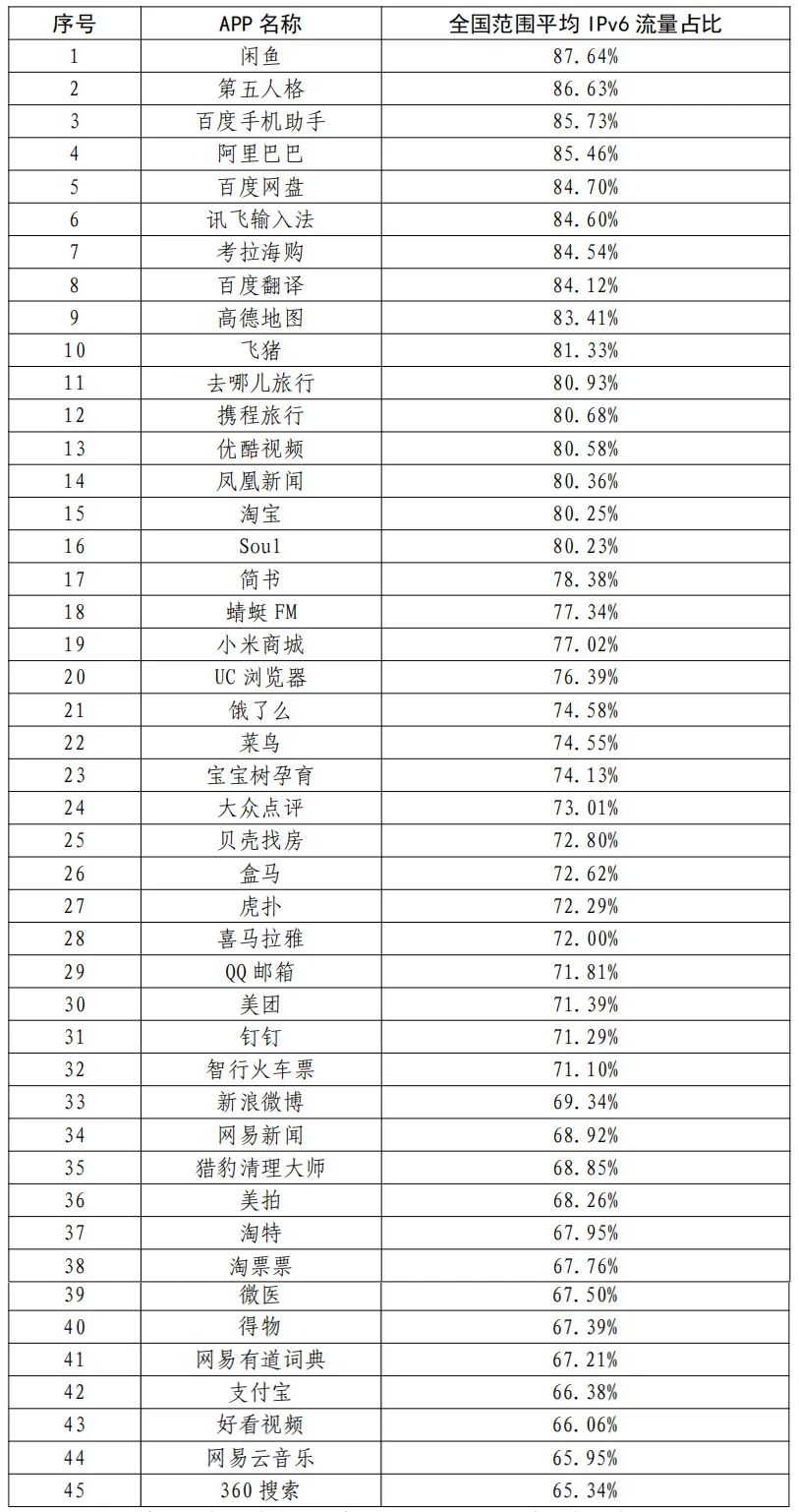 截至2021年10月,纳入监测范围的200款APP均支持IPv6访问,IPv6流量平均占比达39.77%,其中已有45款APP的IPv6流量占比超过65%,名单如下:
