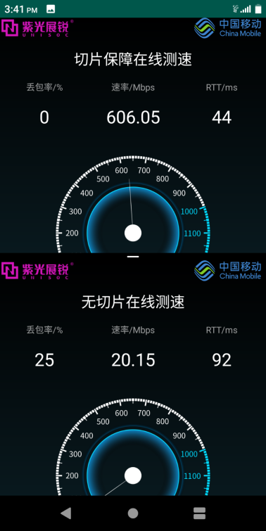 【上图显示:2020年11月19-21日,在广州举行的中国移动全球合作伙伴大会上,展锐联合中国移动等合作伙伴演示的无切片网络接入与切片保障网络接入的业务体验对比】