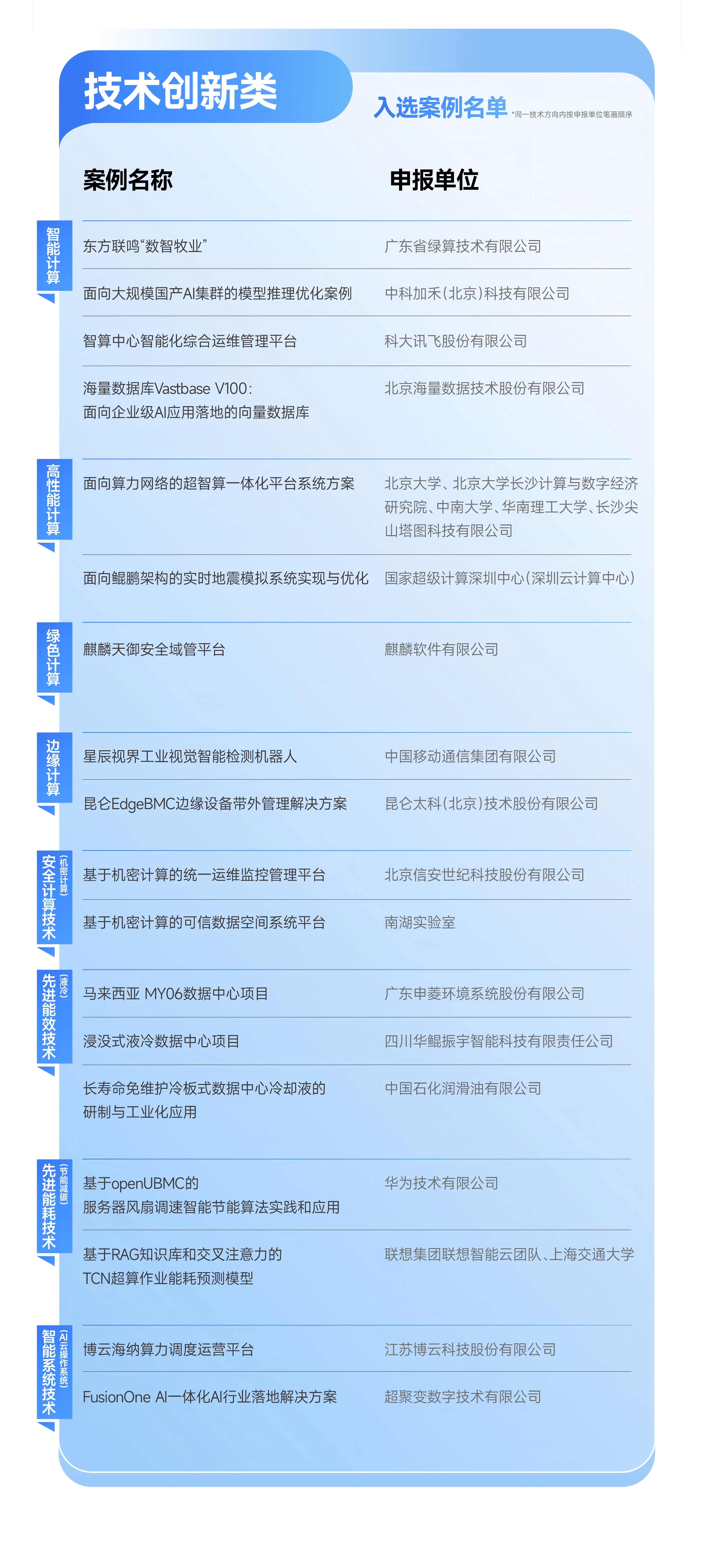 为保障评选专业性,GCC组建由技术指导委员会(TC)、分支机构专家、行业领军学者、权威媒体代表及资深分析师构成的编委会,历经多轮材料审核、技术论证与综合评审,最终筛选出年度技术创新与行业应用两大方向的标杆案例,同时首次推评 “编委会特别推荐” 称号,树立具有突破性价值的实践成果标杆。