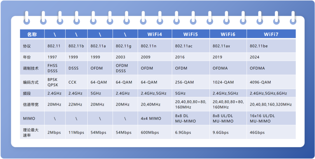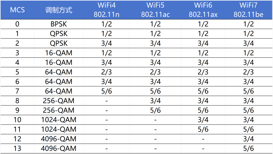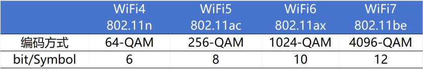 指调制子载波的方式。由于一个子载波承载一个Symbol,编码方式代表着一个Symbol能承载的bit数量,常见编码方式有BPSK、QPSK、QAM。根据以下数据得到WiFi7编码方式目前最大12bit/Symbol。