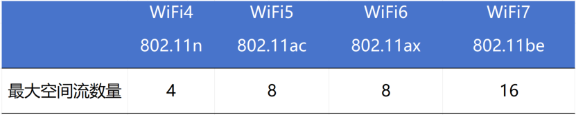 空间流可以理解为设备的天线,一条空间流对应一根天线,空间流越多,则天线越多,整机吞吐量也越大。根据以下数据得到WiFi7空间流数最大16条。