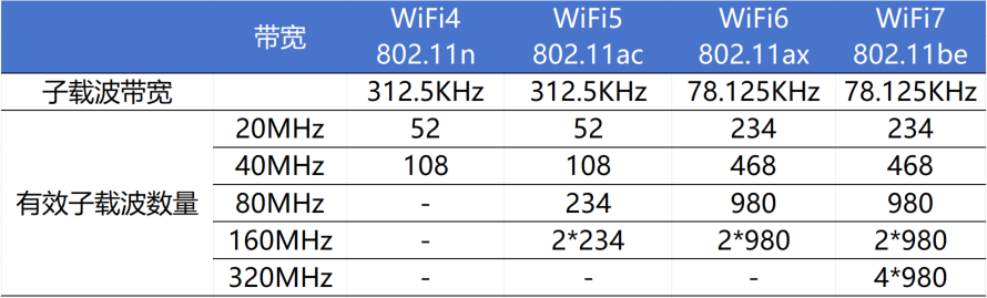 子载波是用于数据传输的频域信号,是频域资源的一部分,不同调制方式及不同频宽下的子载波数量不一样,和带宽以及每个子载波的带宽相关。根据以下数据得到WiFi7有效子载波数量最大3920(4*980)。