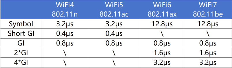 符号时间是Symbol时间与GI时间相加的和。Symbol表示一次传输的数据,是时域上的传输信号;GI是相邻的两个Symbol之间的时间空隙,以避免 Symbol 之间相互干扰。根据以下数据得到WiFi7最小符号时间是13.6us(12.8us+0.8us),也即0.0000136s。