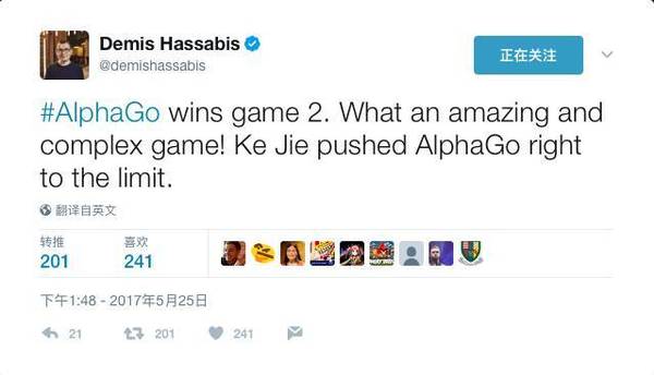 今日中国乌镇围棋峰会的赛况异常激烈。AlphaGo采用柯洁本人第一场的招数,开局前4手与首局一模一样。中途柯洁布局不完全模仿棋,到AlphaGo白20直接二路点、人机战局势复杂出现劫争,全程人机大战争锋相对。后半程劫争消除之后,柯洁不得不面对之前为制造劫材下出的右上和右下两块白棋,黑棋优势变大,柯洁面临难局,挣扎数手之后无奈认输。