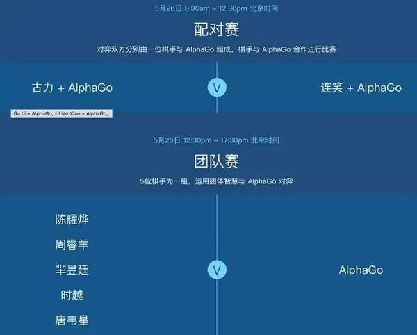 5月26日,中国乌镇围棋峰会还安排PairGo(古力+AlphaGo VS 连笑+AlphaGo,AlphaGo作为队友加入古力与连笑的对阵),TeamGo(中国五大世界冠军联手组成“围棋天团”对阵AlphaGo)