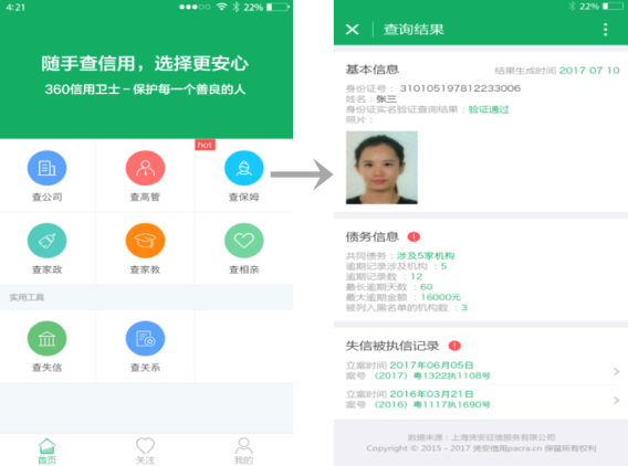 此外,近期由于杭州保姆案导致的恶劣影响,社会大众对于家政服务类人员的信用也愈发重视。用户可通过360信用卫士结合已有数据针对保姆、家教等有社会属性身份的个人进行信用查询。查询内容包含:姓名和身份证的身份一致性验证、是否存在失信被执行、通过债务数据查询此人是否存在相关债务等。