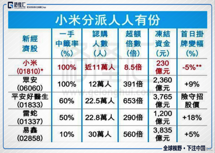 日前港媒曾报道过,小米认购人数为为11万人,整体一手(200股)中签率100%。从分配结构来看,逾2.5万人获派1手,有1.5万人获派2手,大户组方面最大一户申购为1000万股,最后获分97.2万股,即4860手,中签率为9.72%。分析这些数字区间便知道,货几乎在大额投资者上,筹码集中度较过去的众安在线、平安好医生及易鑫集团等都要高。