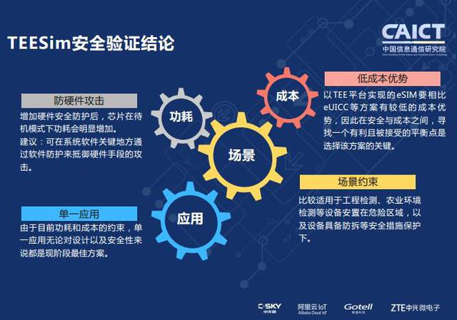 泰尔实验室专家国炜表示,TEE eSIM安全级别可以达到一些大规模物联网应用的要求,适合部署在工程检测、农业环境检测等设备设置在危险区域的应用场景。TEE的低成本优势,让终端设备厂商更容易在安全与成本之间找到一个平衡点。