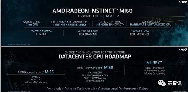 未来,AMD还将继续推出下一代的MI-NEXT,性能更强,连接性更好,软件兼容性更佳——或许是Navi架构?