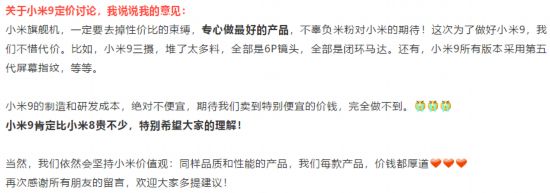 雷军表示,小米9的制造和研发成本,绝对不便宜,期待我们卖到特别便宜的价钱,完全做不到。不过他也提到“依然会坚持小米价值观:同样品质和性能的产品,我们每款产品,价钱都厚道。”