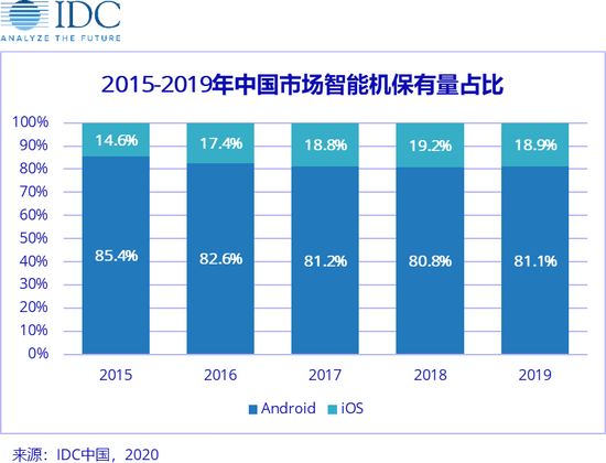 根据《IDC中国手机保有量报告》,由于相较安卓机型具有更长的换机周期, iOS系统手机,即苹果的国内保有量始终占据较高比重。2019年占比虽相较2018年有所下滑,但依旧以18.9%的份额成为国内保有量基数最大的厂商。