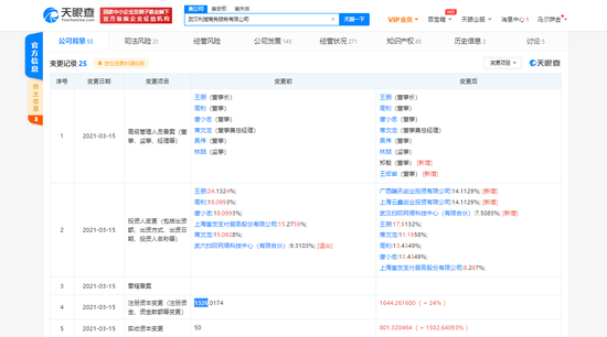 3月16日上午消息,天眼查App显示,3月15日,利楚扫呗关联公司武汉利楚商务服务有限公司发生多项工商变更,新增股东广西腾讯创业投资有限公司、上海云鑫创业投资有限公司,两家公司持股比例相同,均约为14%。同时,该公司注册资本由约1326万人民币增至约1644万人民币,增幅24%。其中,上海云鑫创业投资有限公司由蚂蚁科技集团股份有限公司全资持股。