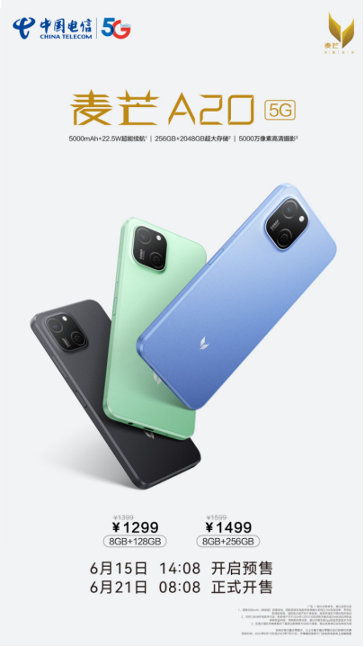 本次发布的麦芒A20拥有幻夜黑、宝石蓝、薄荷绿三款配色,并配备128G和256G两个版本,售价1399元起,首销限时优惠立减100元,6月15日14:08开启预售,6月21日8:08正式开售,消费者可以到各大电商、电信营业厅和授权零售商处进行预订购买。