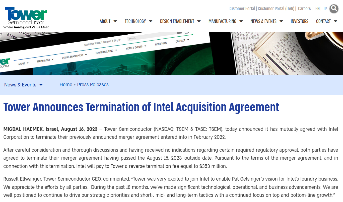 高塔半导体指出,经过仔细考虑和深入讨论,并没有收到任何有关某些必要监管批准的迹象,双方同意在2023年8月15日之后终止合并协议。根据合并协议的条款,以及与此次终止相关的条款,英特尔将向高塔半导体支付3.53亿美元的反向终止费。