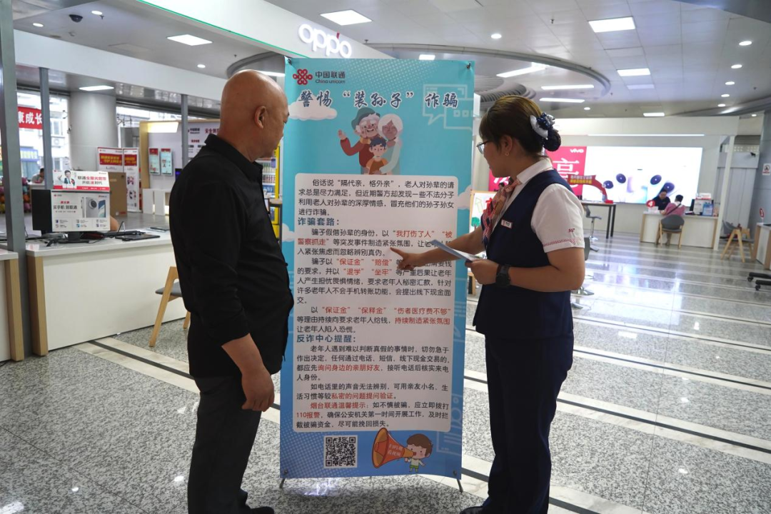 除技术反制外,烟台联通同步构建起“科技+人文”双重防护体系。针对AI模型识别的潜在高危用户,在实施智能外呼预警的同时,系统会自动推送防诈短信提醒。不仅如此,烟台市联通营业厅均设置反诈宣传专区,通过动态展板与案例二维码实现精准科普;联通志愿者组成的宣讲团持续深入社区,为老年群体量身定制防骗专题讲座。