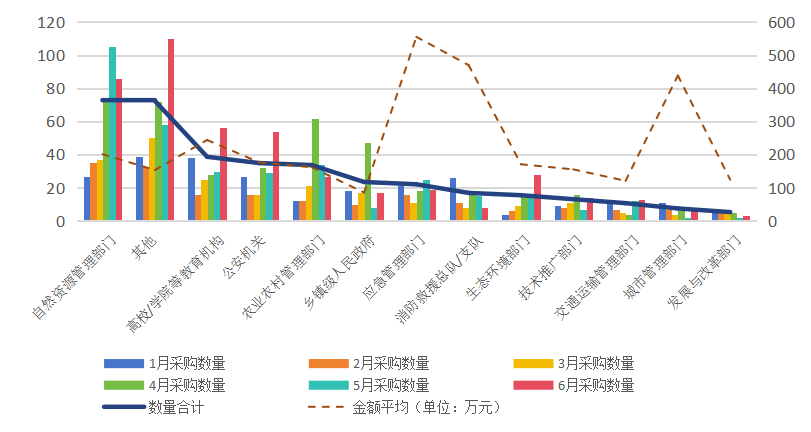 上半年公开投资采购市场整体呈现上升趋势,自然资源管理和应急管理部门采购需求最为旺盛。上半年公开采购累计发生1830起,已披露总金额达到39亿元。其中五月采购金额位居榜首,占上半年全部采购金额的25%。自然资源管理部门和应急管理部门上半年共计采购13亿元,采购金额位居前二。此外,应急管理、消防救援、城市管理等部门财力雄厚,平均采购金额位居前三。