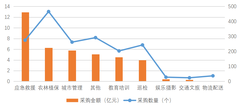 应急救援和农林植保是目前发展较为成熟的场景,应急救援类相对单价更高。农林植保上半年采购数量最多,共发生466起;应急救援类场景采购金额最多,超12亿元,其中无人机或直升机以及配件等硬件金额占比达90.6%。以政府主导的公共服务类场景如应急救援等大单相对集中,与政策补贴资金流向相同,如应急部门上半仅发生110次采购,平均每笔采购事件达到555万元。行业类采购如农林植保高频小单较多,部分农业公司提供防治等服务,服务价格相对采购更低,依据防治面积定价(目前单价≤20元/亩)或随采购农药产品搭售。