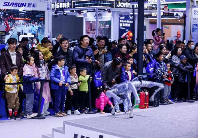 宇树科技展台前一个小型拳击台上,两个小巧灵活的机器人正激烈对战,它们出拳迅速、闪避敏捷,引得周围观众阵阵喝彩。这是本届博览会人头攒动、热闹非凡的鲜活写照。