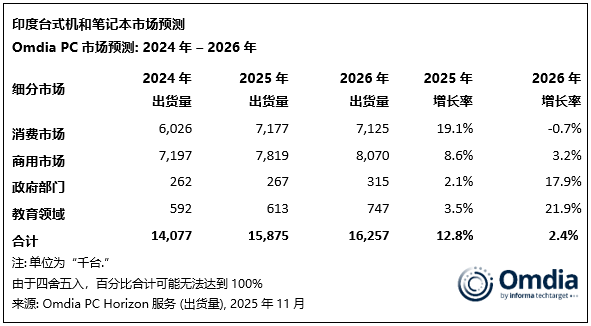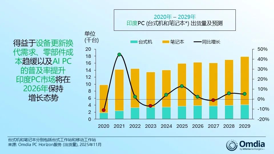 Omdia预计,2025年,印度PC市场将实现13%的增长,主要得益于节庆季持续的终端销售表现以及中端产品升级需求的延续。Aithal补充道:“进入2026年,零部件供应和价格环境预计将面临更大挑战,买家可能会提前采购周期,以在价格上涨前加快采购。”