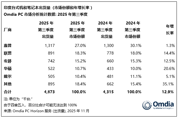 通信世界网消息(CWW)Omdia最新研究显示,2025年第三季度,印度PC市场(不含平板)出货量创历史新高,出货量达到490万台,同比增长13%。其中,由于厂商在节庆季前加快备货,以及商用客户交付保持稳定,笔记本电脑出货量升至400万台,同比增长12%。台式机出货量同比增18%,达到92万台。相比之下,2025年第三季度,印度平板市场同比下滑19%至160万台。尽管消费者需求保持相对稳定,但政府主导的教育项目招标与部署大幅延期,影响整体表现。