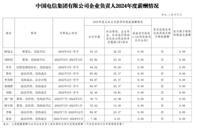 中国电信董事长柯瑞文应付年薪95.35万元。2024年5月从中国联通调任的总经理梁宝俊,1-5月在联通的薪酬为33.93万元,5-12月在电信的薪酬为55.62万元,应付年薪为89.55万元。另有5位高管薪酬较2023年小幅增长。