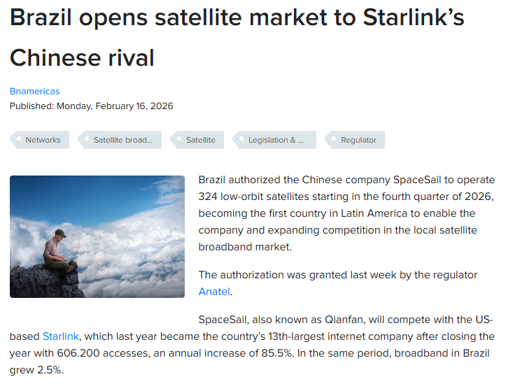 通信世界网消息(CWW)巴西授权中国公司SpaceSail自2026年第四季度起运营324颗低轨卫星,成为拉美第一个允许该公司运营的国家,同时也扩展了本地卫星宽带市场的竞争。该授权上周由监管机构Anatel颁发。