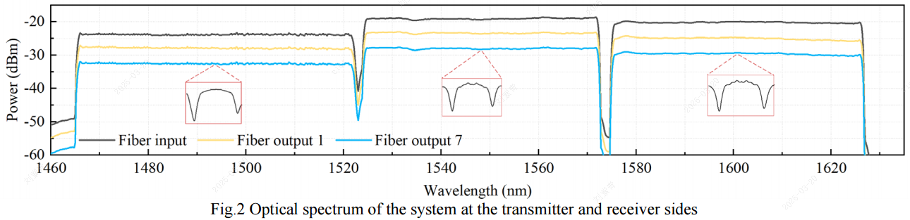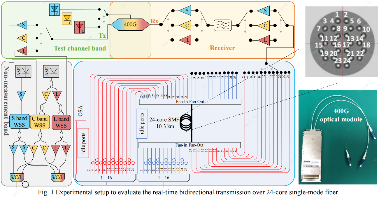 在空分复用方面,宽带WDM信号经分光器复制为多路,并通过扇入扇出器件耦合进入24芯单模光纤,实现空间信道扩展。同时,纤芯采用双向传输设计,相邻信道传输方向相反,有效抑制串扰,使系统在无需复杂MIMO处理的情况下稳定运行。