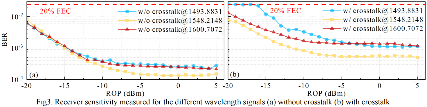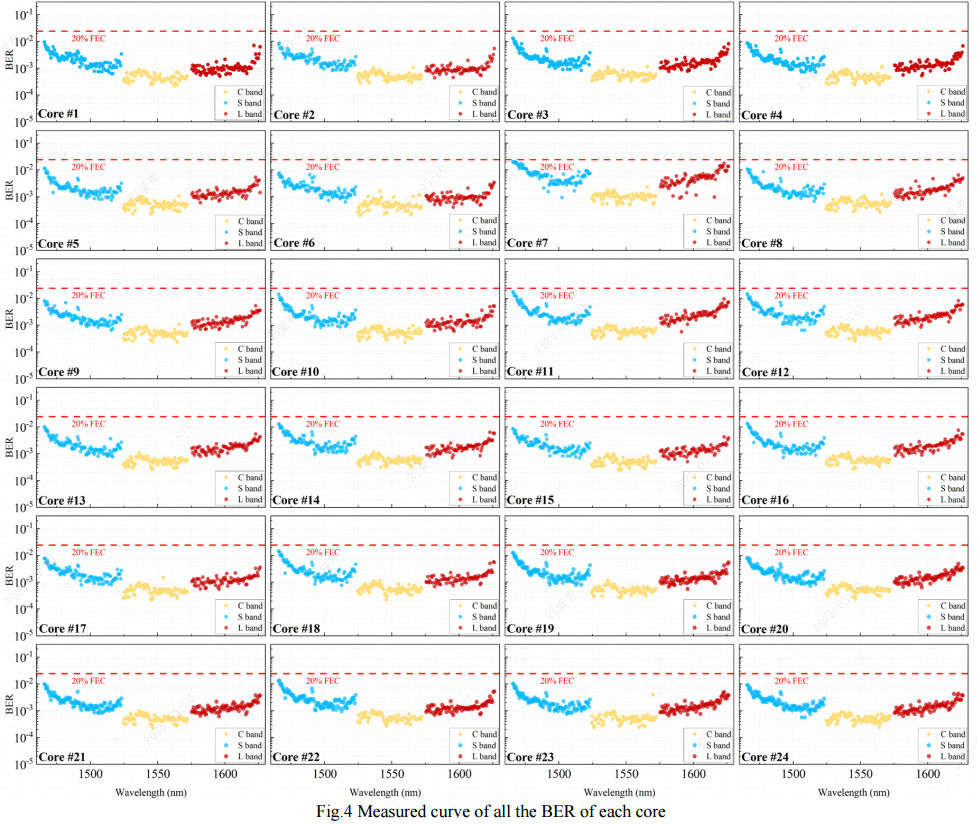 全部WDM信道的误码率(BER)均低于20%软判决前向纠错(SD-FEC)门限(2.4×10-2),验证了系统在大规模并行传输场景下的可靠运行能力。