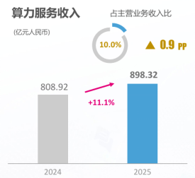 2025年,算力和智能成为中国移动最大亮点:算力服务、智能服务收入占主营业务收入比为20.2%,同比提升1.4个百分点。其中算力服务收入近900亿,增速超11%;智算服务收入增速达279%,实现爆发式增长。与此同时,算力网络加快布局,智算总规模达92.5 EFLOPS。
