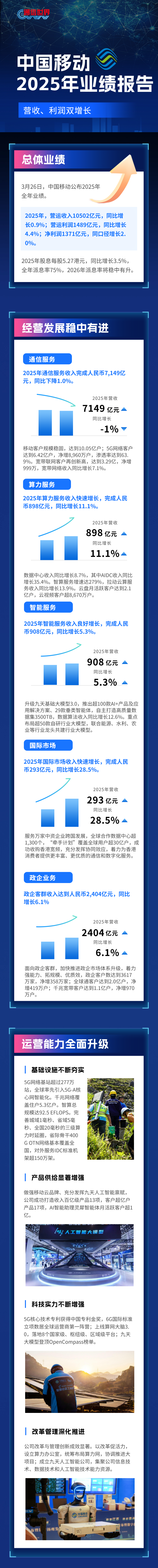 2026年是“十五五”规划的开局之年,中国移动表示将持续做强做优做大通信、算力、智能服务,推动实现质的有效提升和量的合理增长。一方面,着力提质增效,提升核心竞争力。焕新通信服务,加速算力服务,提升智能服务;深化网络强基,深化数智强能,深化品牌强企。另一方面,推进科技创新,发展新质生产力。坚持创新领先,提升投资效益,更好地投资于网;加快新兴产业布局,更快地投资于新;全面推进人才发展,更强地投资于人。中国移动将努力实现收入稳健增长、利润同口径协同增长,向“世界一流科技服务企业”迈出坚实步伐,持续为广大股东、客户创造更大价值。