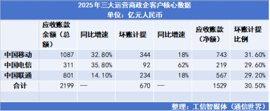 2025年,中国电信、中国联通、中国移动应收账款规模均再创新高,政企客户应收账款余额合计高达2199亿元,与此同时,2025 年三大运营商政企坏账准备同步激增,中国移动从290亿元增至344亿元,中国联通从198亿元增至234亿元,中国电信从57亿元增至92亿元,其中中国移动政企坏账占整体坏账比例超80%。
