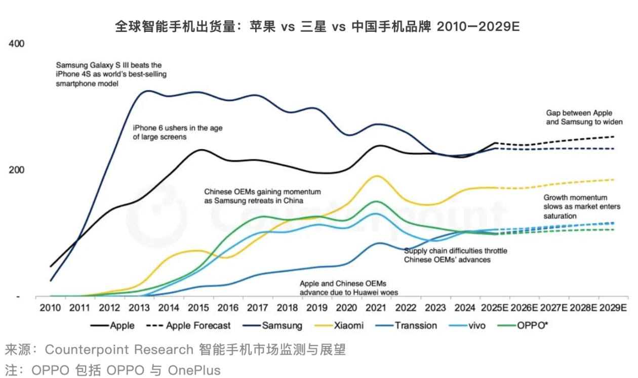 报告还提到,苹果预计将于 2026 年上半年推出 iPhone 17e,作为 iPhone 16e 的后续机型,也是“e”系列第二款产品。同年年底,苹果预计还将发布其首款折叠屏 iPhone,并有望在2027年底推出首款翻盖折叠 iPhone。随着出货量的回升以及更高价位的折叠屏产品的推出,苹果预计将在本十年内继续稳居全球智能手机市场营收榜首。