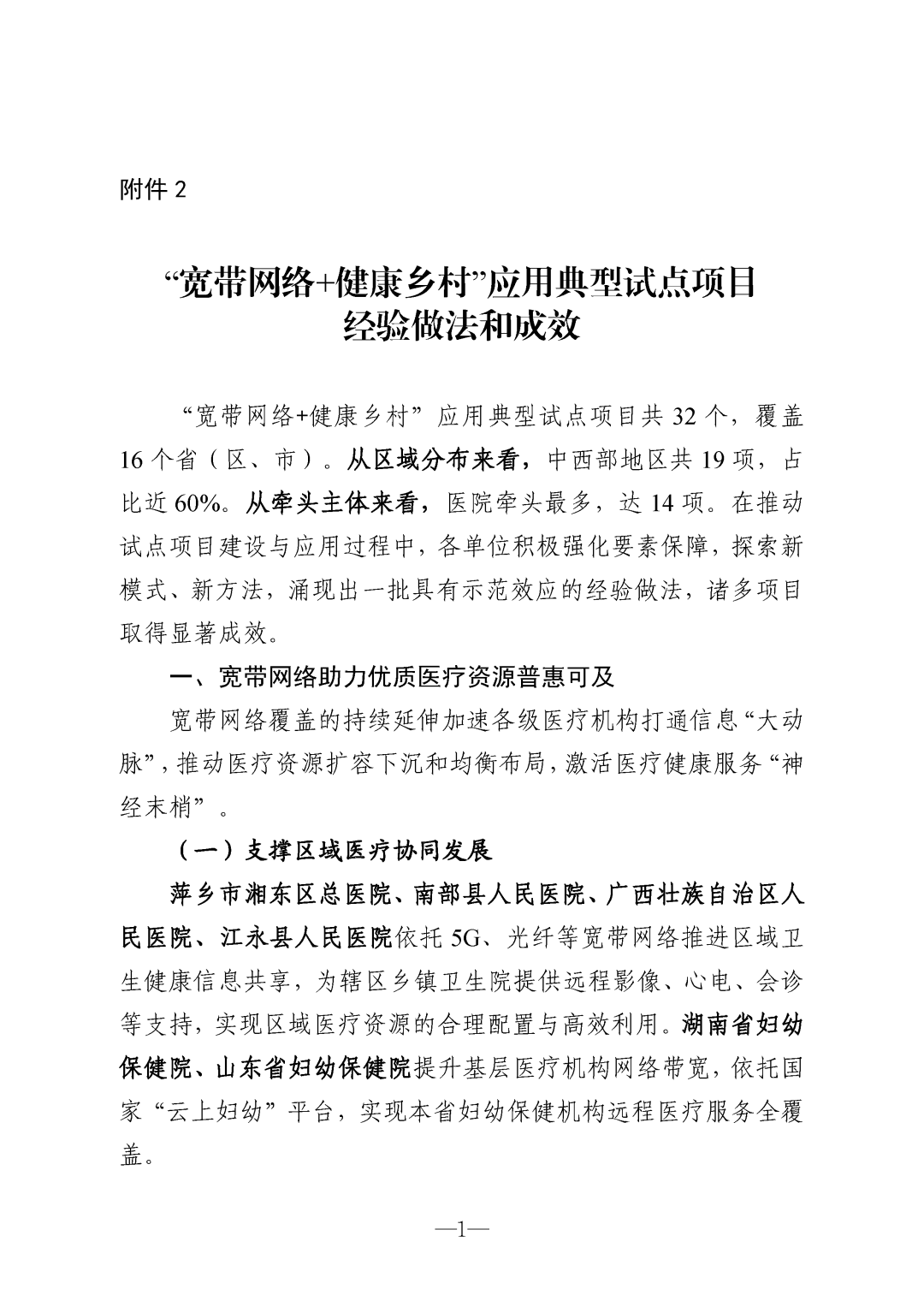 在推动试点项目建设与应用过程中,各单位强化要素保障,推动宽带网络赋能各级医疗机构打通信息“大动脉”,促进医疗资源扩容下沉和均衡布局,加快5G、千兆光网等高质量网络逐步与医疗健康服务融合,对急救、诊断、愈后管理等服务升级起到重要支撑作用,涌现出一批具有示范效应的经验做法(见附件2)。请各地通信管理局、工业和信息化主管部门、卫生健康主管部门结合试点项目经验做法,加大宣传推广力度,拓展“宽带网络+健康乡村”应用场景,充分发挥农村地区宽带网络建设成效,持续提升农村地区卫生健康服务能力。